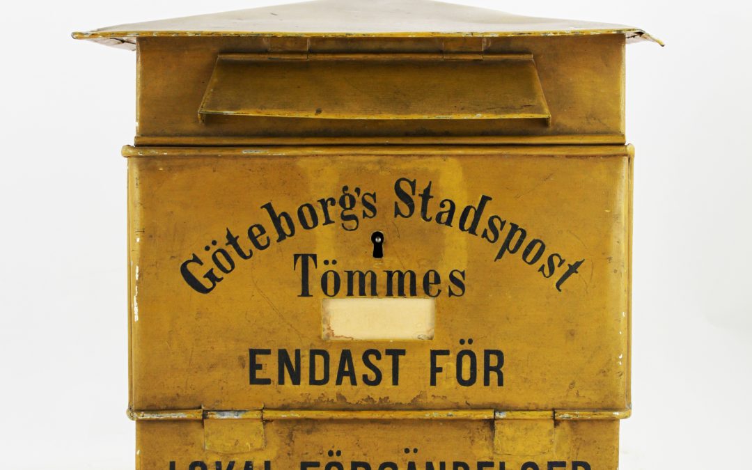 Det här är en tidig gul brevlåda från 1888 men det är inte Postverkets låda. Postverkets brevlådor var fortfarande svarta. Den här brevlåda tillhörde lokalpostföretaget Göteborgs stadspost. Företaget grundades av Ellen Maria Wiberg (1864 – 1949). Stadsposten satte upp 19 brevlådor i olika delar av staden. Tyvärr fick bolaget lägga ner redan 1889. Det konkurrerades ut av ett annat lokalpostföretag i staden.