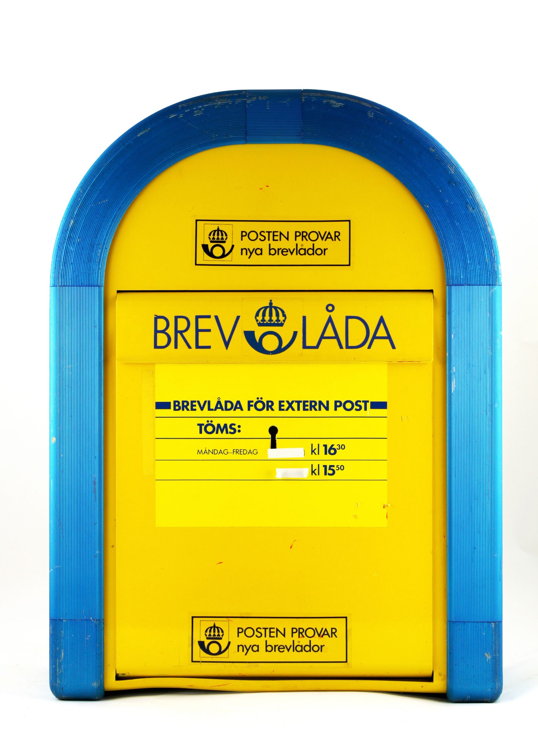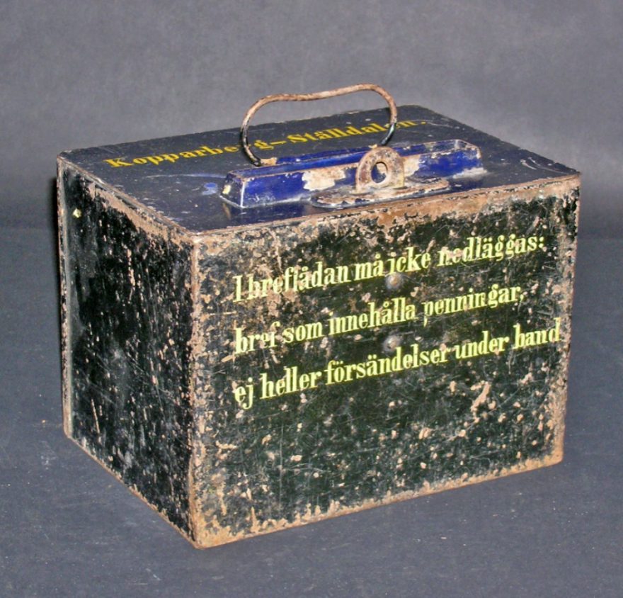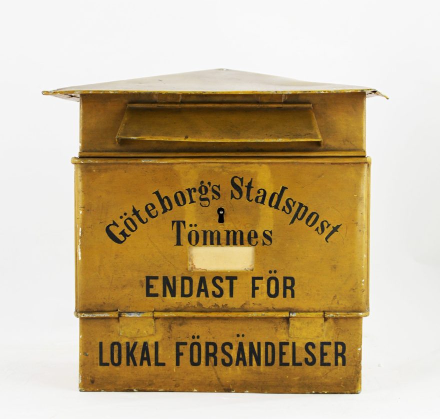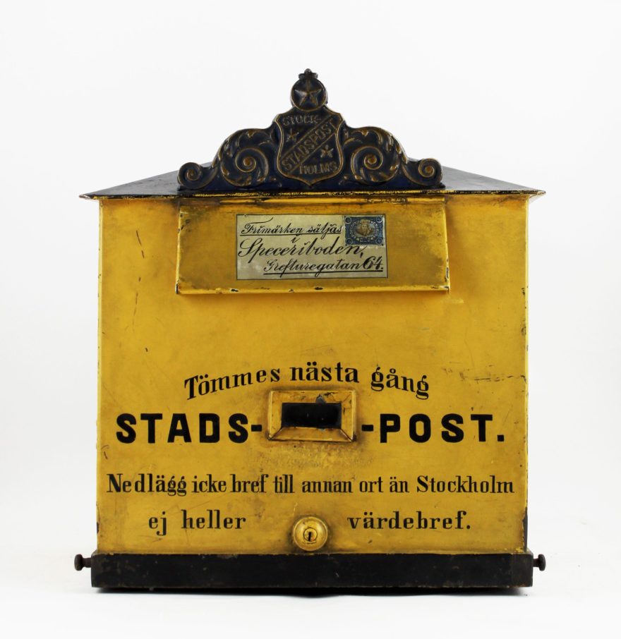 I Sverige införs frimärken ganska sent,1855. Det året sätts också de första brevlådorna upp. Men redan innan dess användes brevlådor på ångbåtar. Vi har massor av brevlådor i våra samlingar! Allt från stora korsbands-brevlådor till små omnibuss-brevlådor. De svenska brevlådorna har inte alltid varit gula. Från början var de svarta. En ganska opraktisk färg kan man tycka med tanke på att städerna inte alls var upplysta på samma sätt som idag.