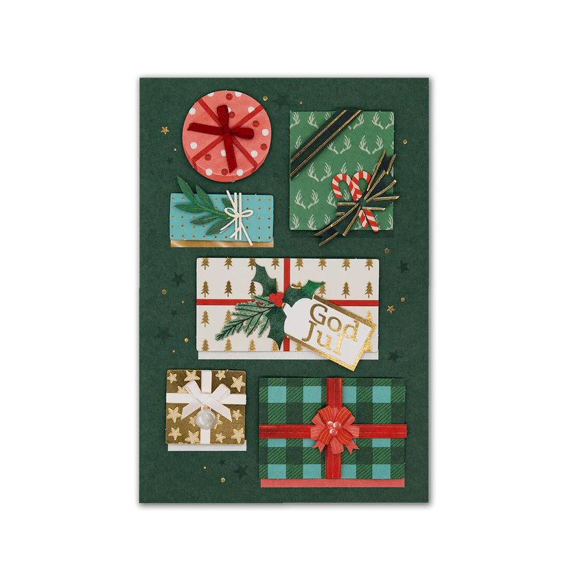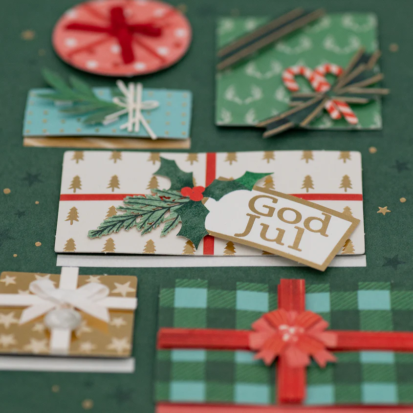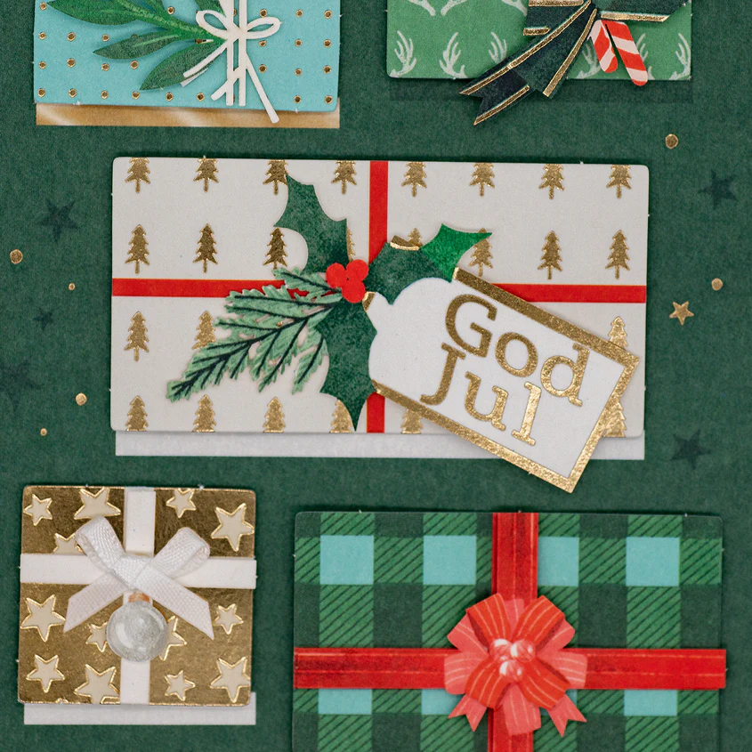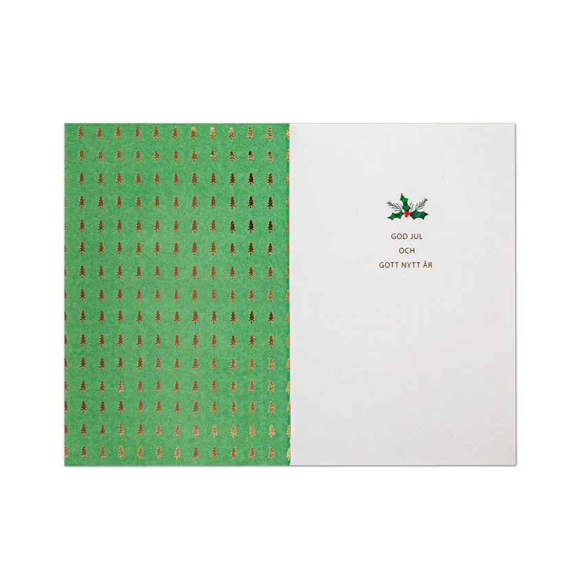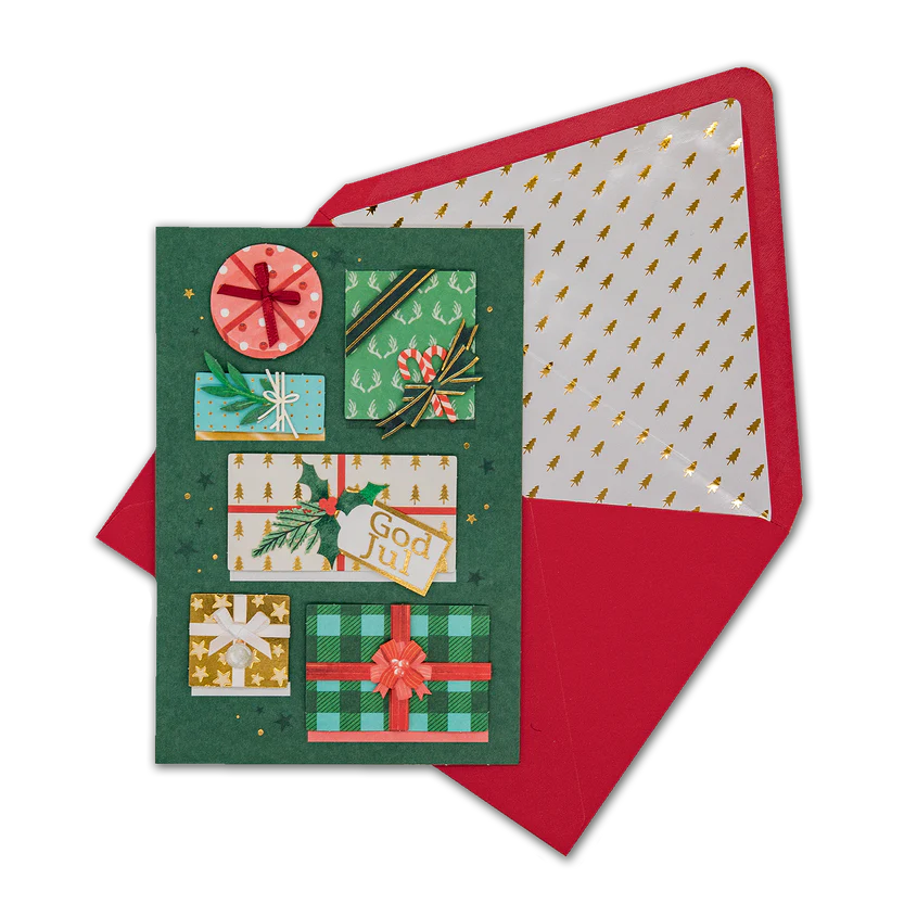 Kuvert med röd utsida och vit och guldfärgad insida medföljer.