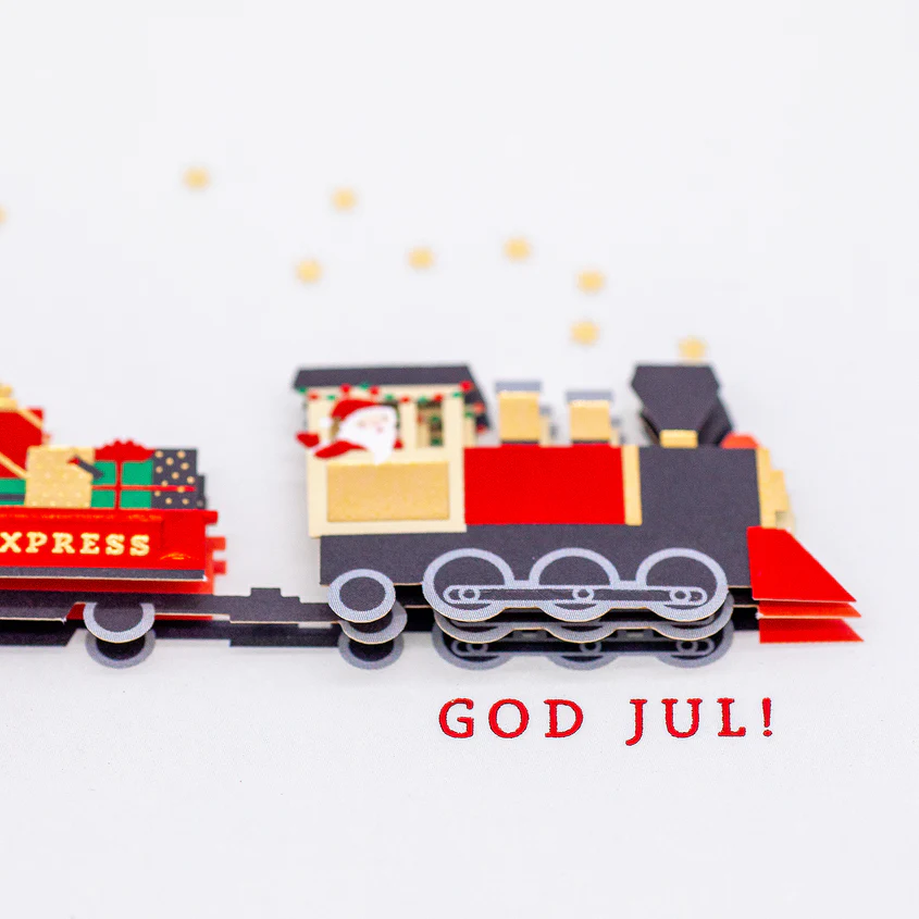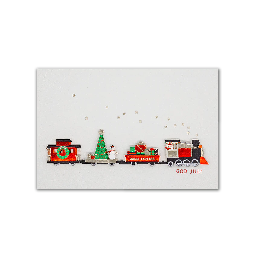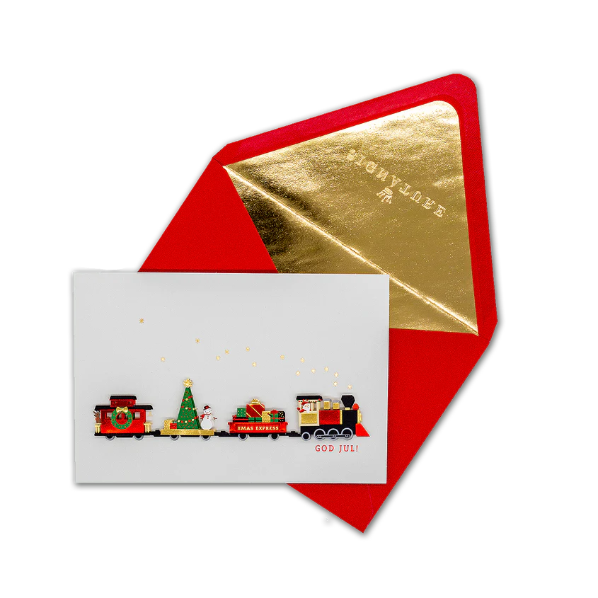 Kuvert med röd utsida och guldfärgad insida medföljer.