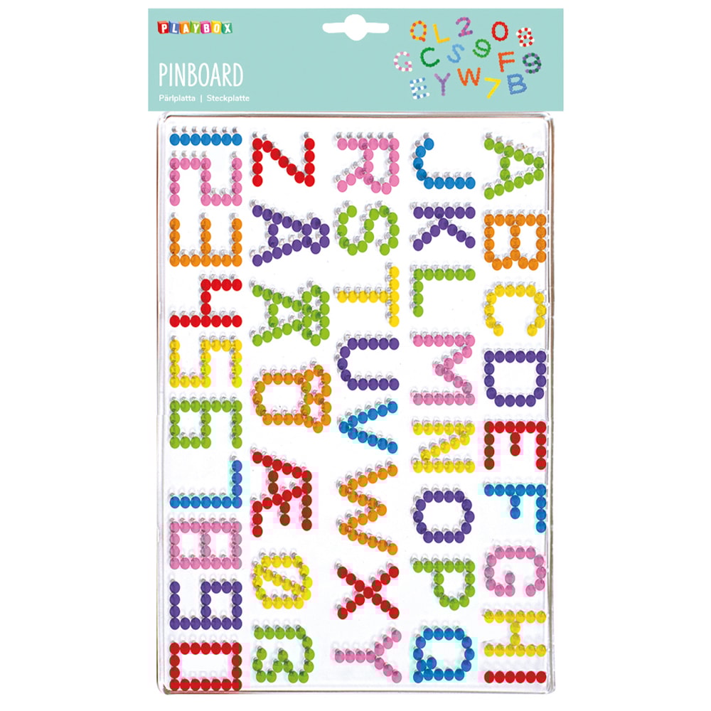 Pärlplatta med bokstäver och siffror samt ett mönsterkort. Perfekt för att öva på att lära sig bokstäver och siffror på ett kul sätt. Pärlplattan är transparent, vilket gör det lätt att lägga mönsterkort under. Rörpärlor tillkommer.