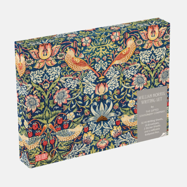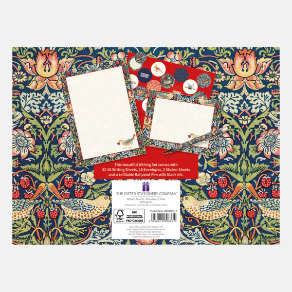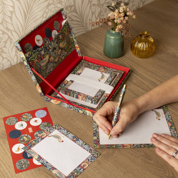 Vacker låda med plats för 32 A5-brevark, 16 kuvert, kulspetspenna, ficka med kil och 2 ark klistermärken.