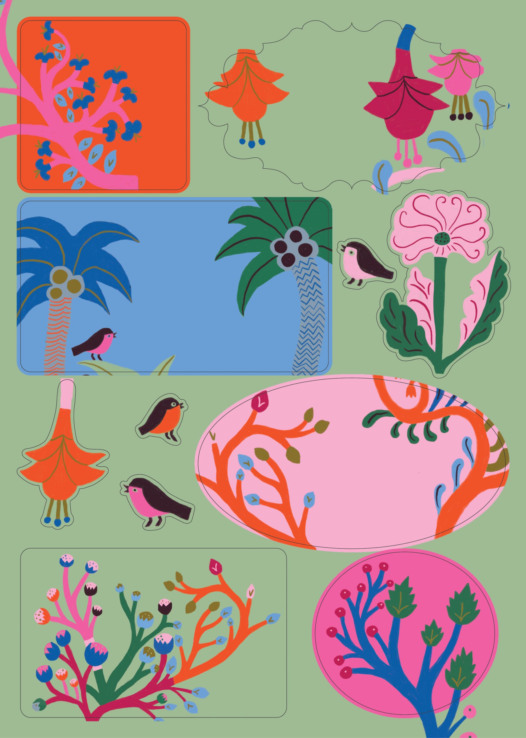 10 brevpapper (två olika mönster), 10 kuvert och två blad med klistermärken. Design Monika Forsberg.