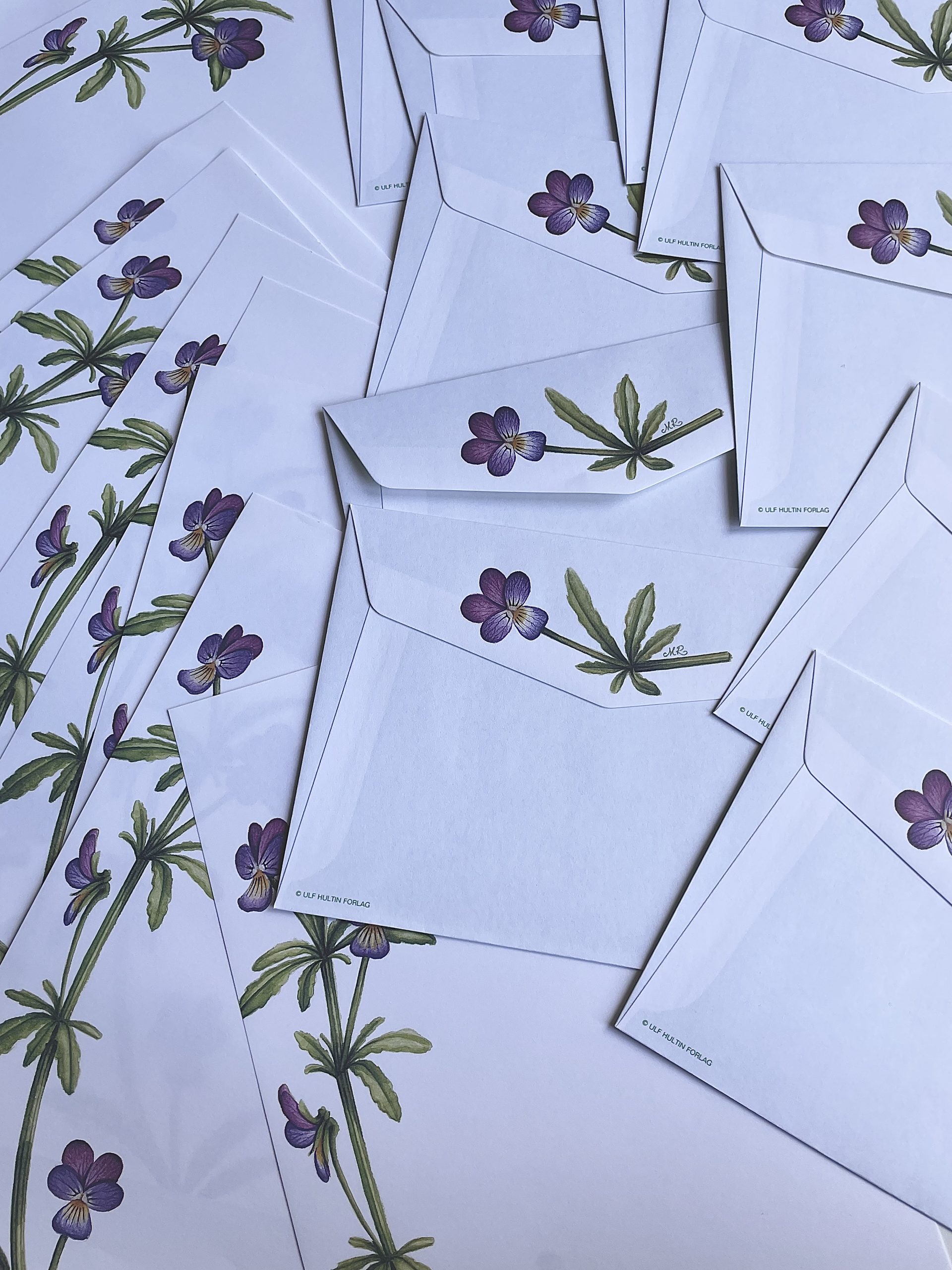 10 brevpapper 22 cm x 15,5 cm, 10 kuvert 16 X 11,4 cm. Tryckt i Sverige av Ulf Hultin förlag, Svanen märkt. Olinjerat papper. Ett linjerat papper följer med som kan läggas under brevpappret för att åstadkomma rakare rader.